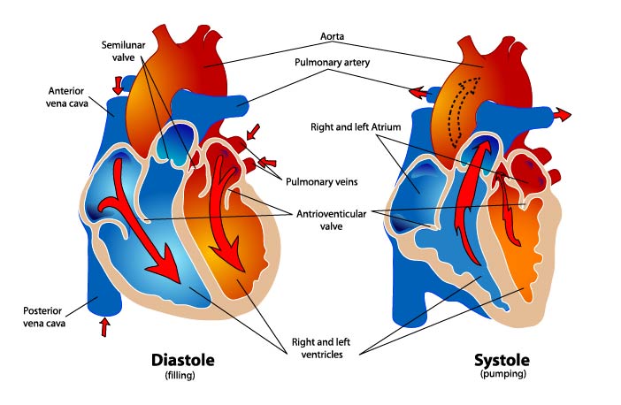 A healthy heartbeat is made up of two phases. In the filling phase (Diastole), Oxygen-poor blood flows from the bodily circulation back into the Right Atrium, through the valve, and into the Right Ventricle. At the same time Oxygen-rich blood flows out of the lungs, into the Left Atrium, through the valve and into the Left Ventricle. The contraction phase (Systole) follows: the heart muscle contracts, the valves between the Atria and the Vetricles close, the pressure in the Ventricles rises and the Semi-lunar valves to the body and lungs open. Through this mechanism, the Oxygen-poor blood from the Right Ventricle is pumped to the lungs, and the Oxygen-rich blood to the bodily circulation. While the Ventricles are emptying, the Atria are already filling with new blood, and the circulation begins again from the beginning. How frequently the heart beats in order to pump blood throughout the body is called the heartrate.