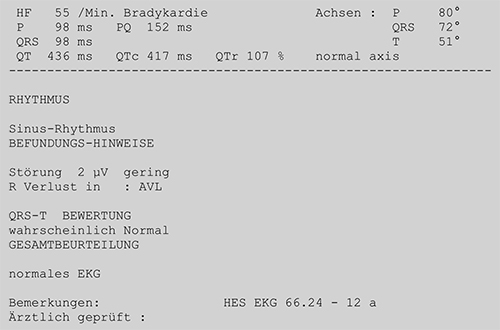The accurate and reliable analysis and interpretation of 12-lead ECG data is crucial to use the time during medical examinations effectively. The automatic ECG interpretation uses the internationally evaluated HES-algorithm and also includes the paramater measurement of all common ECG segments.